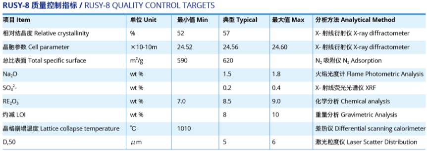 RUSY-8稀土超穩Y分子篩,含RE2O3混合氧化稀土≥7%,根據用戶需要,可以調節稀土中La2O3和CeO2的比例,晶胞參數的大小可根據用戶需要進行調節。